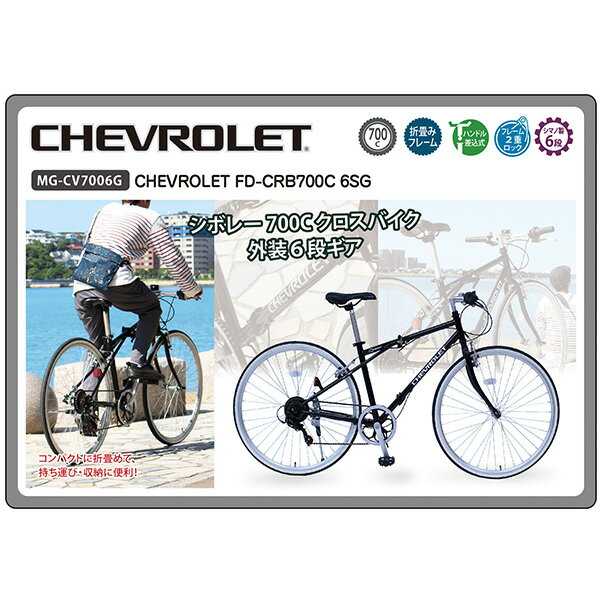 ・自転車名称/CHEVROLET FD-CRB700C6SG・商品サイズ:700C (組立時)約W175×D57.5×H95cm (折畳時)約W100×D58×H86cm・サドルの高さ:約78.5〜93.5cm・商品重量:約14.2kg・個装サイズ:約W101×D34×H78cm・個装重量:約17.2kg・材 質:スチール(リム:アルミ合金)・カラー:ブラック・仕 様:折畳みフレーム・6段変速■注意事項※一部お客様組立(※簡単な組立・調整が一部必要です。